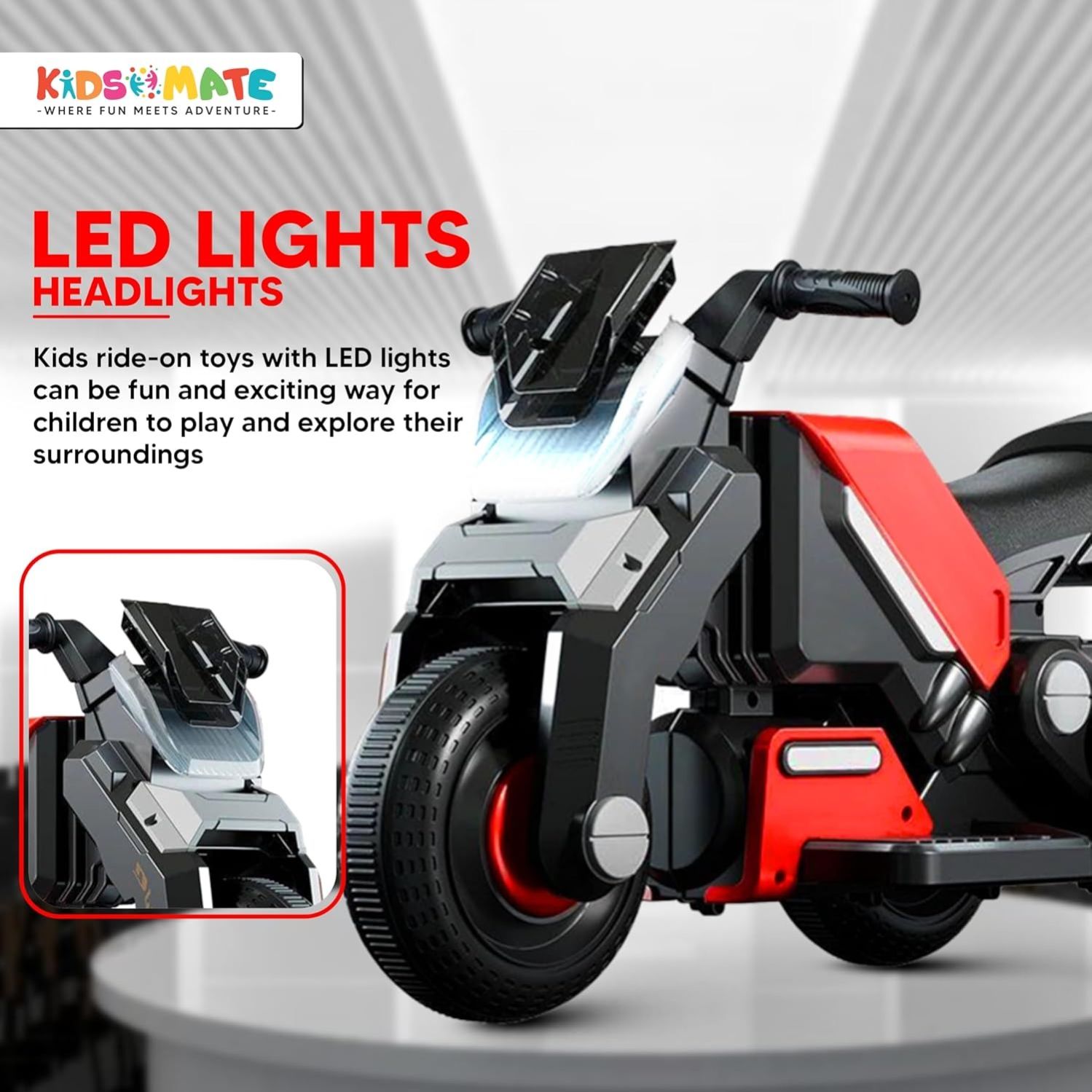Battery : Rechargeable 6V 6.5 Ah battery it takes 6-8 Hours to Charge and Gives your Kids non Stop playtime for 3 Hours. Music & LED Headlights : Integrated Bluetooth music player for entertainment and it Gives Decorative Front LED light enhances visibility and adds a fun element. Comfort & Safety : Large and comfortable seat designed for young riders and Large tyres provide stability and a smooth ride. Material: Used ABS (High Quality Plastic) material For Durable construction for long-lasting use. USB Connectivity: The bike includes a USB port that allows kids to connect various devices, such as MP3 players or USB drives. Control: Foot accelerator pedal allows easy speed control regulation and making it simple for your child to manage their ride. Eco-Friendly Power: Powered by a rechargeable battery, this bike offers an emission-free and environmentally conscious mode of transportation. Age Range: Designed specifically for kids aged 1-4 years.