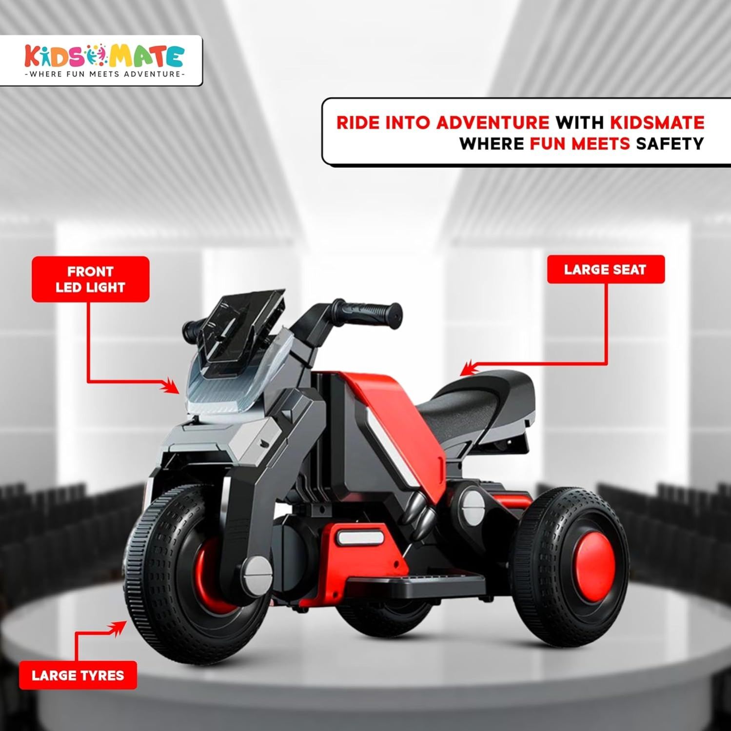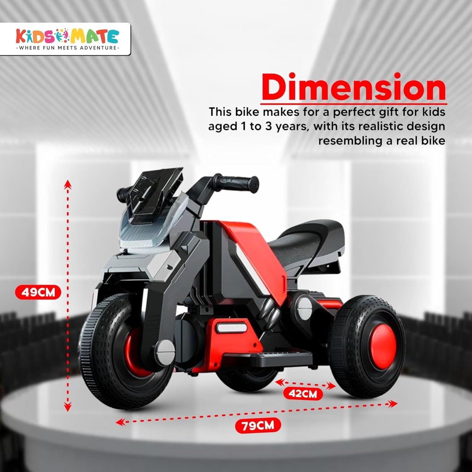 Battery : Rechargeable 6V 6.5 Ah battery it takes 6-8 Hours to Charge and Gives your Kids non Stop playtime for 3 Hours. Music & LED Headlights : Integrated Bluetooth music player for entertainment and it Gives Decorative Front LED light enhances visibility and adds a fun element. Comfort & Safety : Large and comfortable seat designed for young riders and Large tyres provide stability and a smooth ride. Material: Used ABS (High Quality Plastic) material For Durable construction for long-lasting use. USB Connectivity: The bike includes a USB port that allows kids to connect various devices, such as MP3 players or USB drives. Control: Foot accelerator pedal allows easy speed control regulation and making it simple for your child to manage their ride. Eco-Friendly Power: Powered by a rechargeable battery, this bike offers an emission-free and environmentally conscious mode of transportation. Age Range: Designed specifically for kids aged 1-4 years.